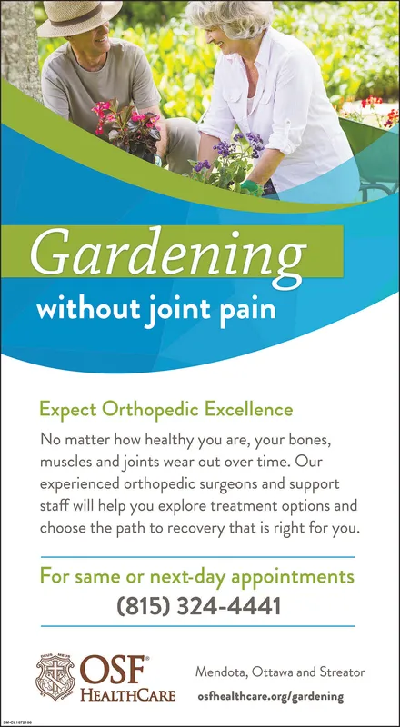 Gardening without joint pain Expect Orthopedic Excellence No matter how healthy you are, your bones, muscles and joints wear out over time. Our experienced orthopedic surgeons and support staff will help you explore treatment options and choose the path to recovery that is right for you. For same or next-day appointments (815) 324-4441 OSF Mendota, Ottawa and Streator HEALTHCARE osfhealthcare.org/gardening SMCLIST21 Gardening without joint pain Expect Orthopedic Excellence No matter how healthy you are, your bones, muscles and joints wear out over time. Our experienced orthopedic surgeons and support staff will help you explore treatment options and choose the path to recovery that is right for you. For same or next-day appointments (815) 324-4441 OSF Mendota, Ottawa and Streator HEALTHCARE osfhealthcare.org/gardening SMCLIST21