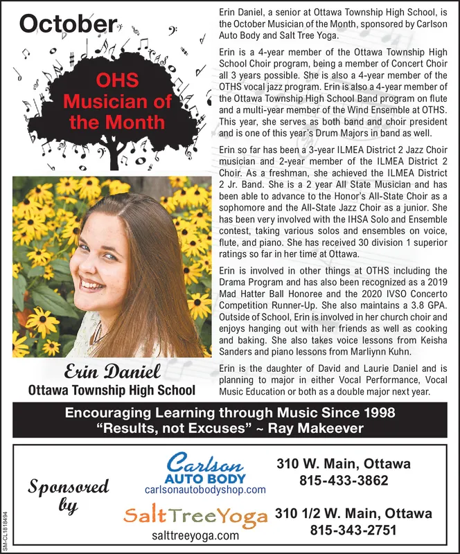 October, Erin Daniel, a senior at Ottawa Township High School, is the October Musician of the Month, sponsored by Carlson Auto Body and Salt Tree Yoga. OHS Musician of the Month Erin is a 4-year member of the Ottawa Township High School Choir program, being a member of Concert Choir all 3 years possible. She is also a 4-year member of the OTHS vocal jazz program. Erin is also a 4-year member of the Ottawa Township High School Band program on flute and a multi-year member of the Wind Ensemble at OTHS. This year, she serves as both band and choir president and is one of this year's Drum Majors in band as well. Erin so far has been a 3-year ILMEA District 2 Jazz Choir musician and 2-year member of the ILMEA District 2 Choir. As a freshman, she achieved the ILMEA District 2 Jr. Band. She is a 2 year All State Musician and has been able to advance to the Honor's All-State Choir as a sophomore and the All-State Jazz Choir as a junior. She has been very involved with the IHSA Solo and Ensemble contest, taking various solos and ensembles on voice, flute, and piano. She has received 30 division 1 superior ratings so far in her time at Ottawa. Erin is involved in other things at OTHS including the Drama Program and has also been recognized as a 2019 Mad Hatter Ball Honoree and the 2020 IVSO Concerto Competition Runner-Up. She also maintains a 3.8 GPA. Outside of School, Erin is involved in her church choir and enjoys hanging out with her friends as well as cooking and baking. She also takes voice lessons from Keisha Sanders and piano lessons from Marliynn Kuhn. Erin Daniel Erin is the daughter of David and Laurie Daniel and is planning to major in either Vocal Performance, Vocal Music Education or both as a double major next year. Ottawa Township High School Encouraging Learning through Music Since 1998 "Results, not Excuses" - Ray Makeever Carlson 310 W. Main, Ottawa AUTO BODY carlsonautobodyshop.com 815-433-3862 Sponsored by Salt TreeYoga 310 1/2 W. Main, Ottawa 815-343-2751 salttreeyoga.com SM-CL1818494 October, Erin Daniel, a senior at Ottawa Township High School, is the October Musician of the Month, sponsored by Carlson Auto Body and Salt Tree Yoga. OHS Musician of the Month Erin is a 4-year member of the Ottawa Township High School Choir program, being a member of Concert Choir all 3 years possible. She is also a 4-year member of the OTHS vocal jazz program. Erin is also a 4-year member of the Ottawa Township High School Band program on flute and a multi-year member of the Wind Ensemble at OTHS. This year, she serves as both band and choir president and is one of this year's Drum Majors in band as well. Erin so far has been a 3-year ILMEA District 2 Jazz Choir musician and 2-year member of the ILMEA District 2 Choir. As a freshman, she achieved the ILMEA District 2 Jr. Band. She is a 2 year All State Musician and has been able to advance to the Honor's All-State Choir as a sophomore and the All-State Jazz Choir as a junior. She has been very involved with the IHSA Solo and Ensemble contest, taking various solos and ensembles on voice, flute, and piano. She has received 30 division 1 superior ratings so far in her time at Ottawa. Erin is involved in other things at OTHS including the Drama Program and has also been recognized as a 2019 Mad Hatter Ball Honoree and the 2020 IVSO Concerto Competition Runner-Up. She also maintains a 3.8 GPA. Outside of School, Erin is involved in her church choir and enjoys hanging out with her friends as well as cooking and baking. She also takes voice lessons from Keisha Sanders and piano lessons from Marliynn Kuhn. Erin Daniel Erin is the daughter of David and Laurie Daniel and is planning to major in either Vocal Performance, Vocal Music Education or both as a double major next year. Ottawa Township High School Encouraging Learning through Music Since 1998 "Results, not Excuses" - Ray Makeever Carlson 310 W. Main, Ottawa AUTO BODY carlsonautobodyshop.com 815-433-3862 Sponsored by Salt TreeYoga 310 1/2 W. Main, Ottawa 815-343-2751 salttreeyoga.com SM-CL1818494